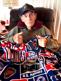 He was provided with a 24-hour caregiver taking very good care of him in addition to frequent visits from his sons, Todd and Guy. Here he is in his recliner, keeping warm with his USMC blanket and hat, although he is quite weak.
